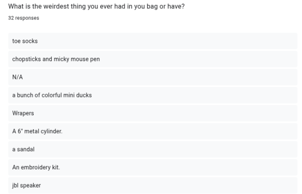 Some of the unusual items I’ve found in people’s bags include toe socks, chopsticks, the wrong car keys, a mini hand, a tutu, mini colorful ducks, and a JBL speaker. The JBL speaker isn’t just a speaker; it has a pretty amusing story.